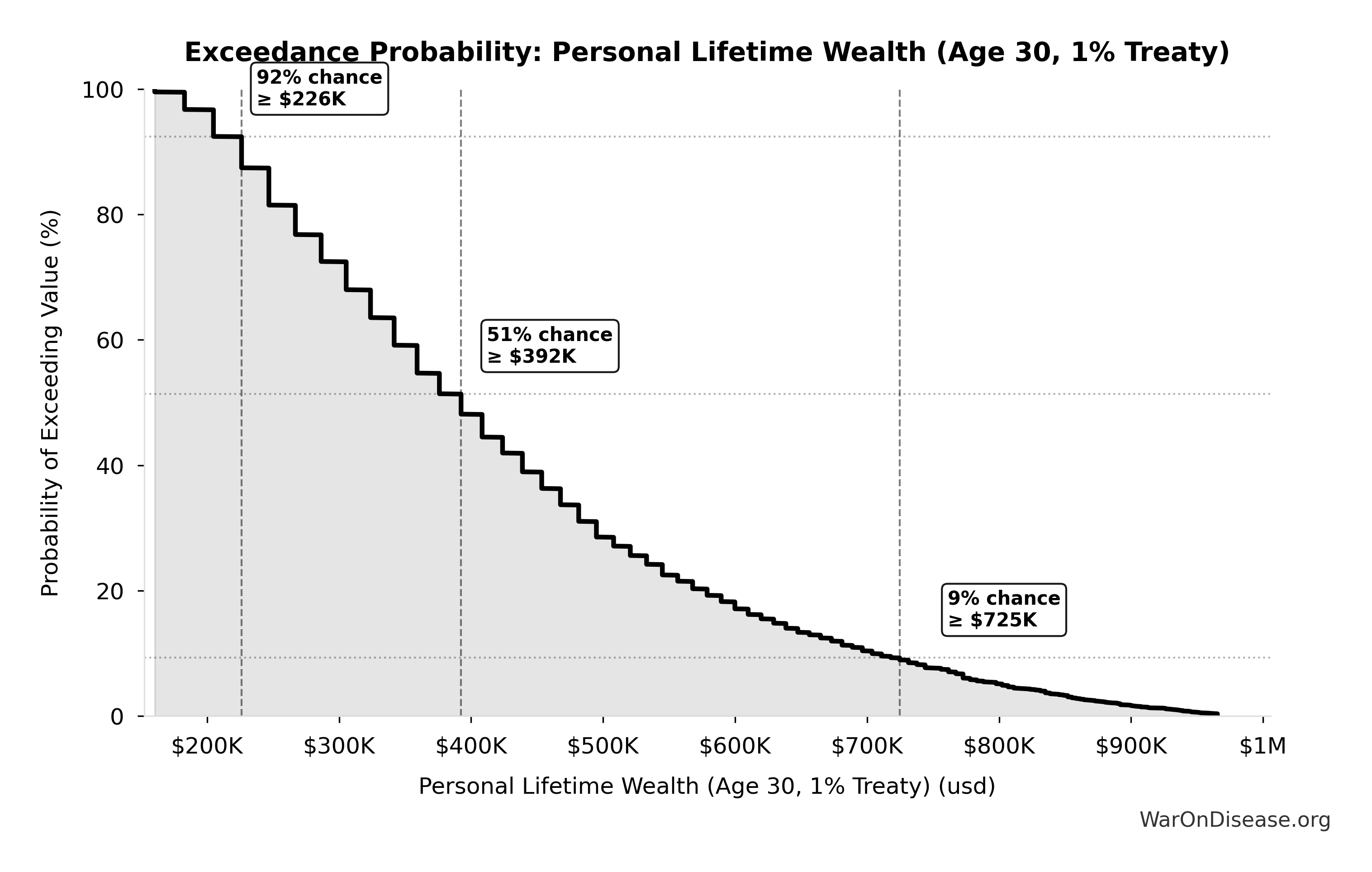 This exceedance probability chart shows the likelihood that Personal Lifetime Wealth (Age 30, 1% Treaty) will exceed any given threshold. Higher curves indicate more favorable outcomes with greater certainty.