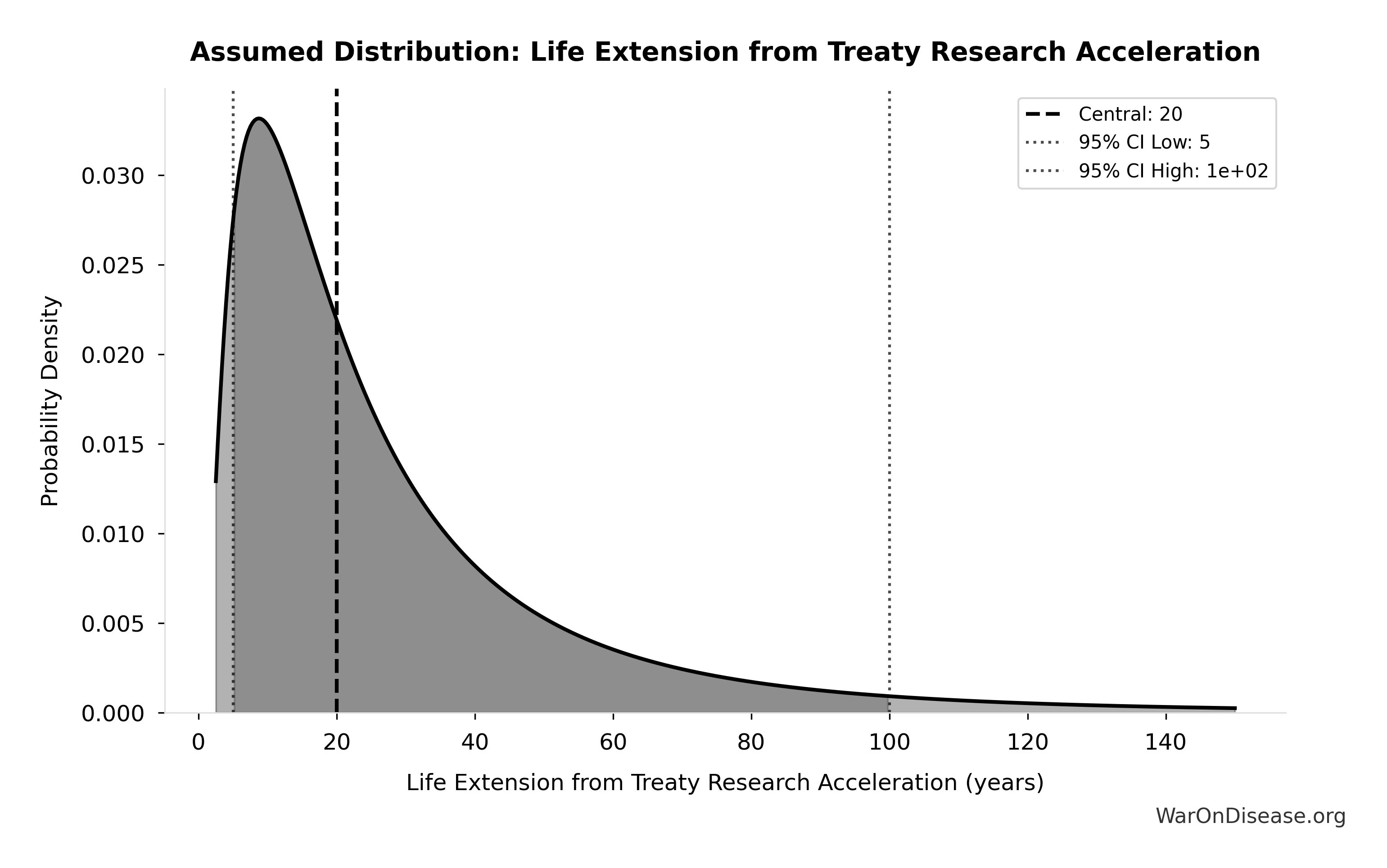 The LIFE_EXTENSION_YEARS parameter captures uncertainty from conservative (5 years, antibiotic precedent) to optimistic (50 years, aging reversal) scenarios: