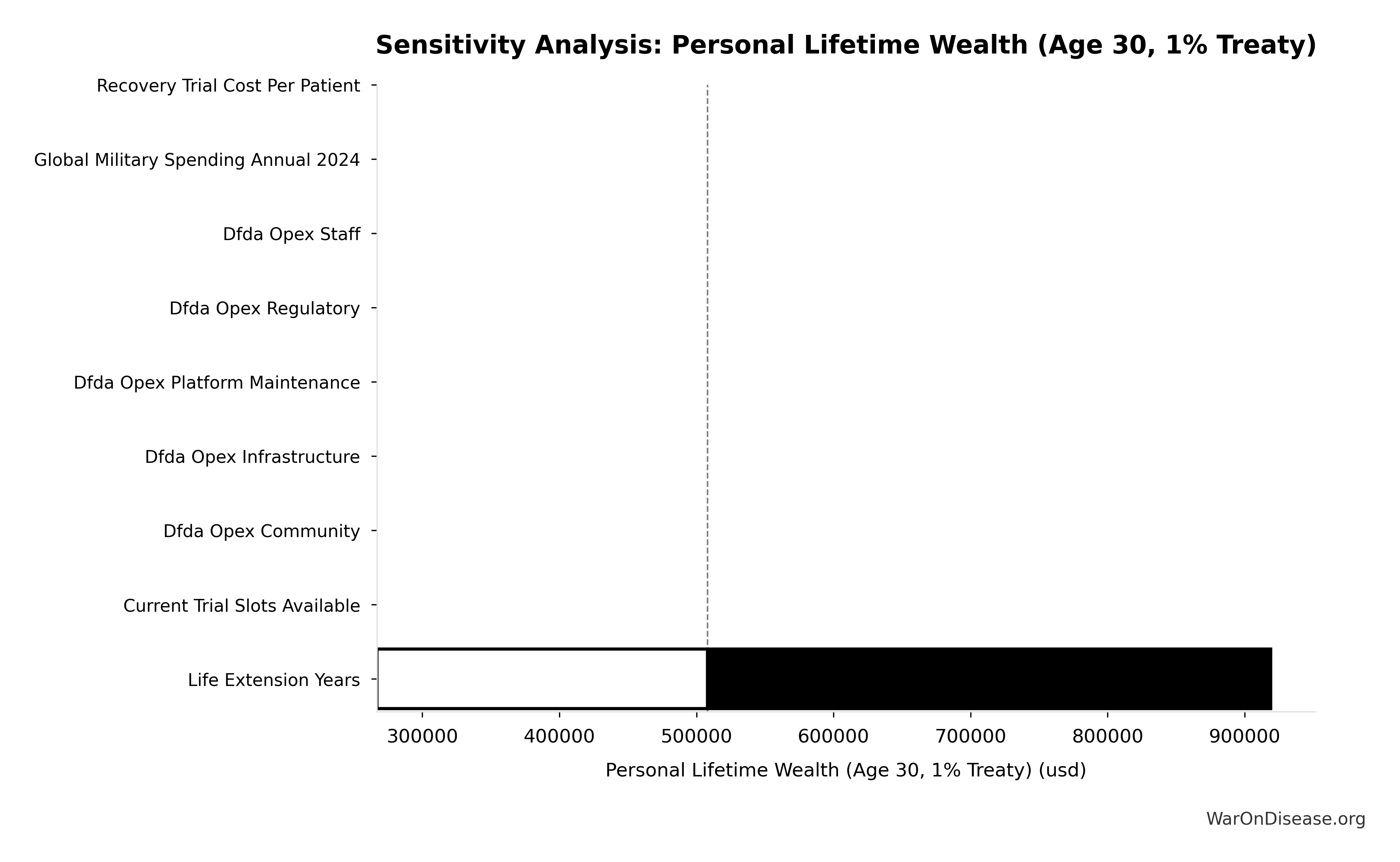 - Disease Eradication: Treaty % ranges $3.6M to $16M (width: $12.4M) - 16x larger impact