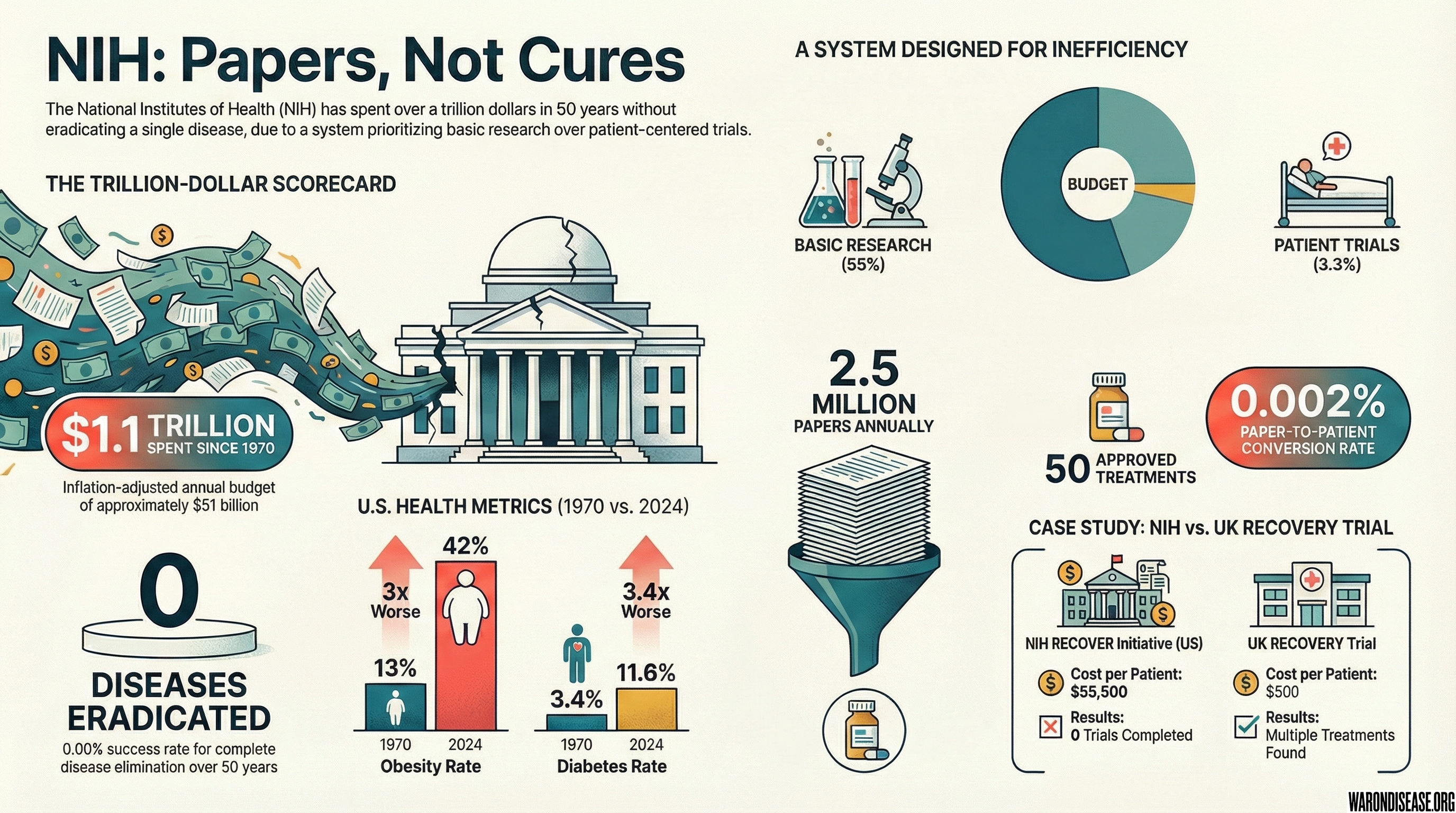 With an annual budget of approximately $51 billion, the National Institutes of Health has spent over $1.1 trillion since 1970 (inflation-adjusted).