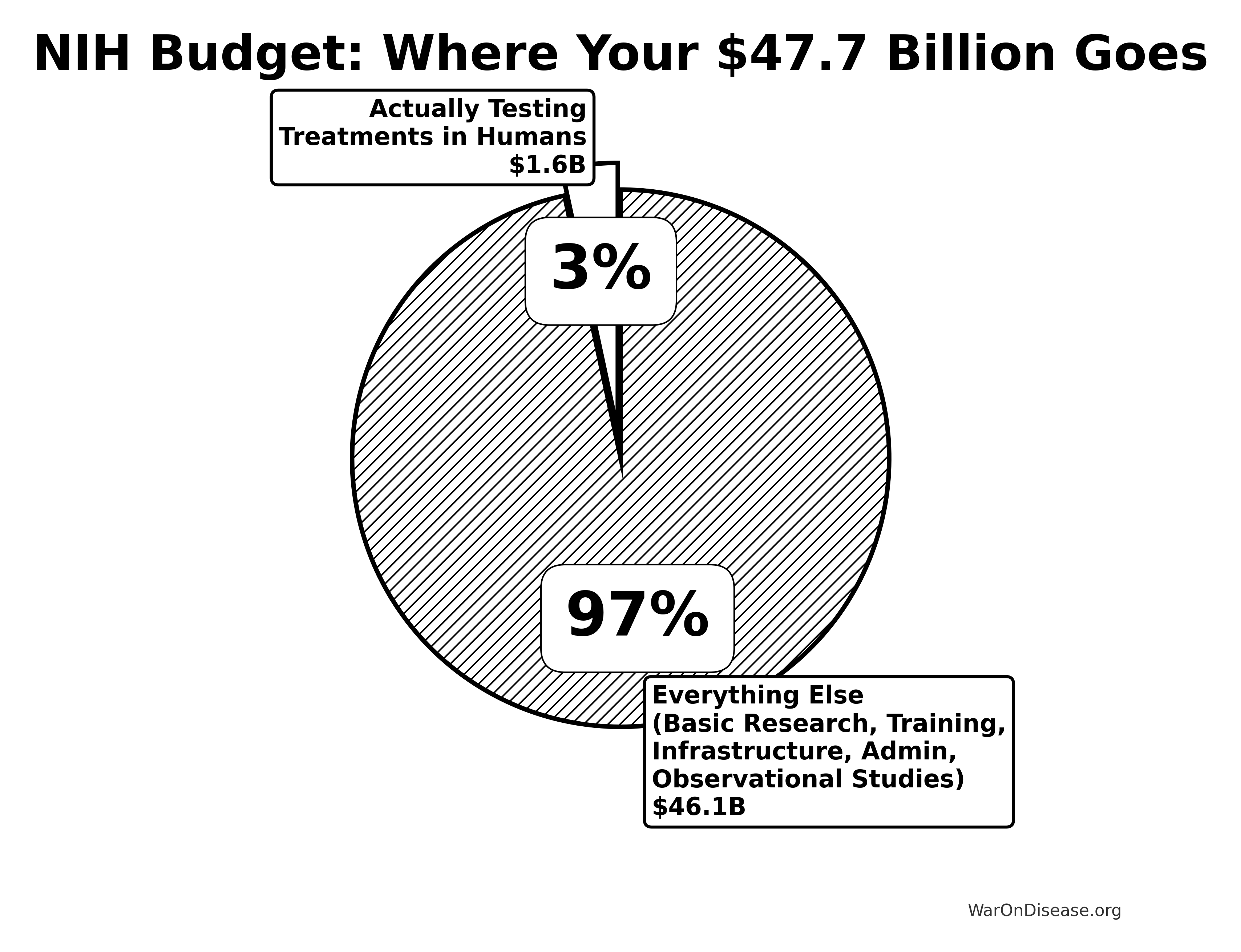 The NIH spend the vast majority of it on “basic research”, understanding disease in mice, while a tiny fraction goes to testing treatments in actual humans.