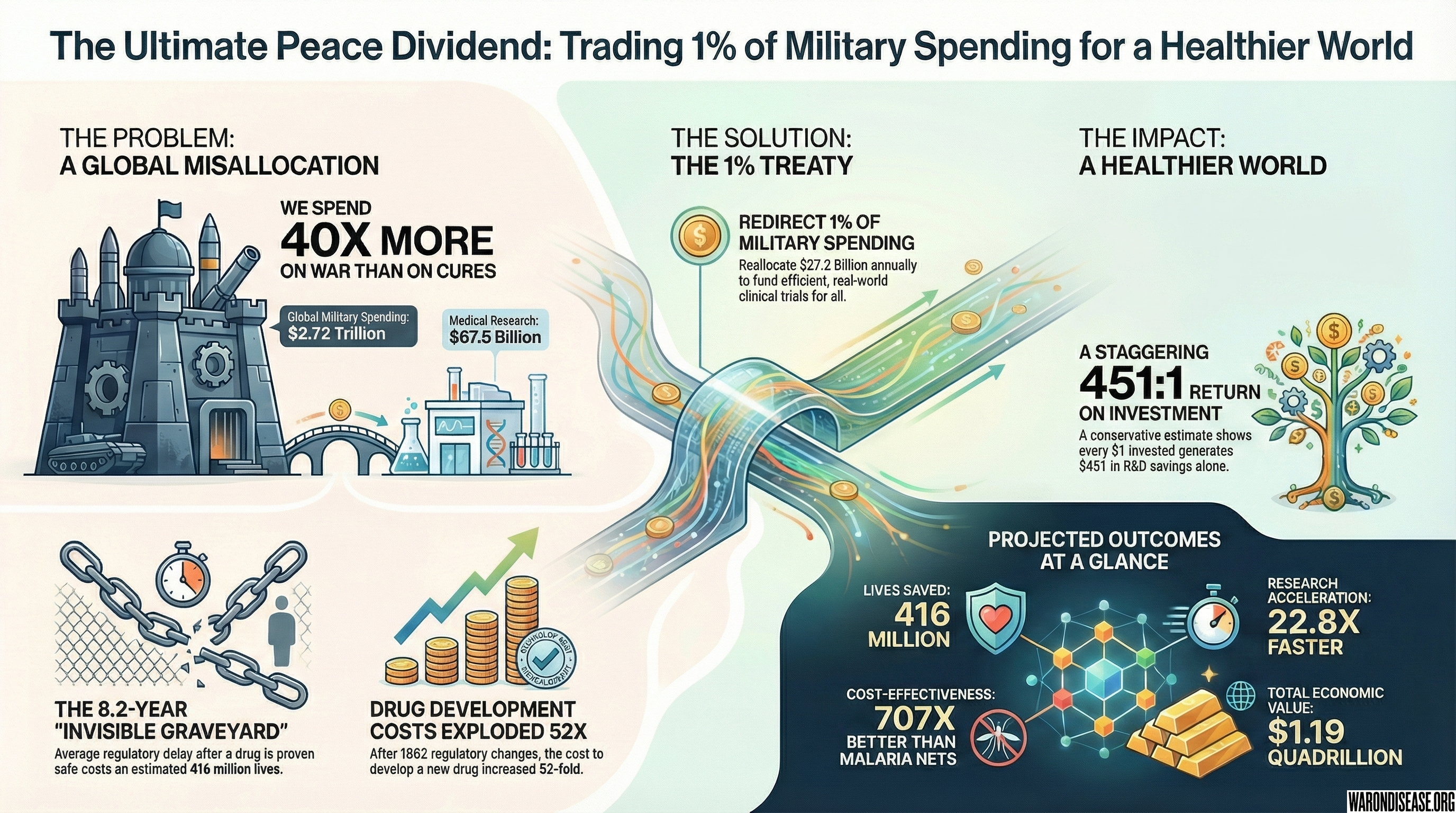 war-on-disease, 1-percent-treaty, medical-research, public-health, peace-dividend, decentralized-trials, dfda, dih, victory-bonds, health-economics, cost-benefit-analysis, clinical-trials, drug-development, regulatory-reform, military-spending, peace-economics, decentralized-governance, wishocracy, blockchain-governance, impact-investing